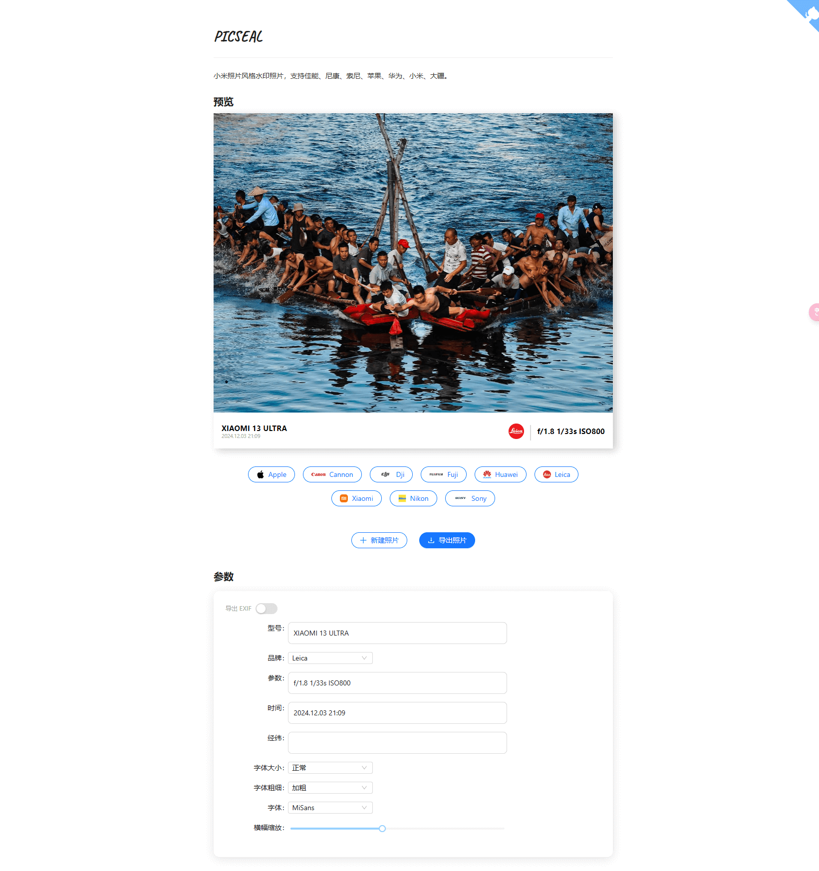 Picseal是一个开源项目,旨在生成类似小米照片风格的莱卡水印照片。它支持多种设备水印生成,包括佳能、尼康、苹果等,并提供在线演示和多种部署方法。项目使用Rust库提取EXIF信息,并通过WASM技术、HTML、CSS和JavaScrip...
