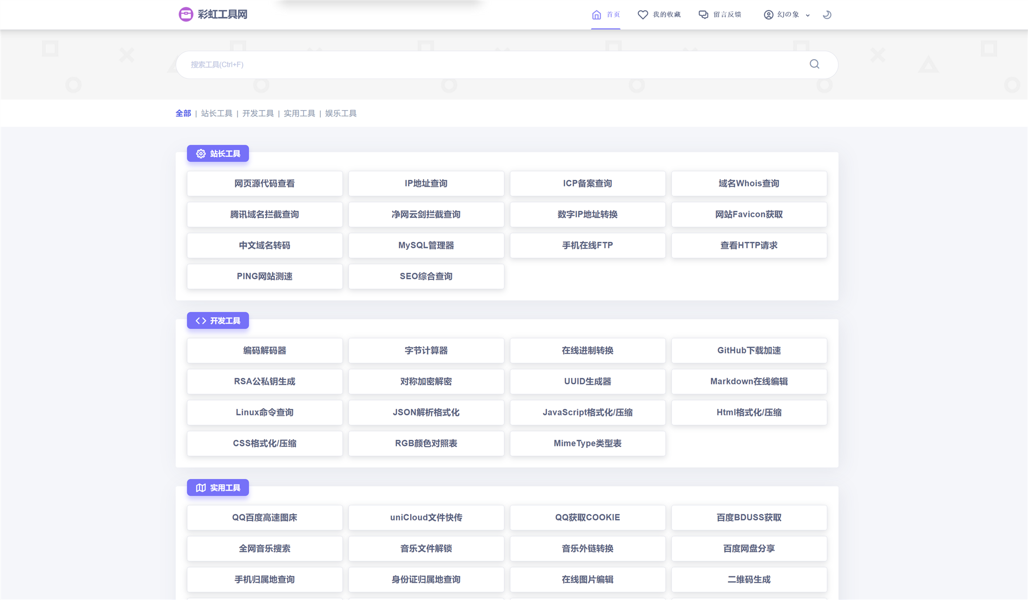 新版彩虹工具网采用ThinkPHP6.0开发,自带70多个工具,包含站长工具、开发工具、实用工具、娱乐工具等分类,支持工具插件扩展,支持留言、用户注册登录、后台管理功能。目前已经更新到了1.9版本,新增了QQ等级查询、短视频解析等多个小工具...