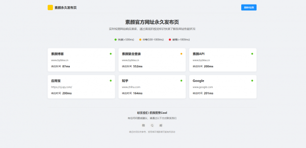 一、核心功能总览网站导航入口:提供素颜系列官方网站+常用平台的快速访问链接;响应速度可视化:用颜色标识(绿/黄/红)直观展示各网站加载速度等级;实时刷新检测:支持手动触发重新检测,更新所有网站的响应时间和状态;响应式布局:适配PC/手机/平...