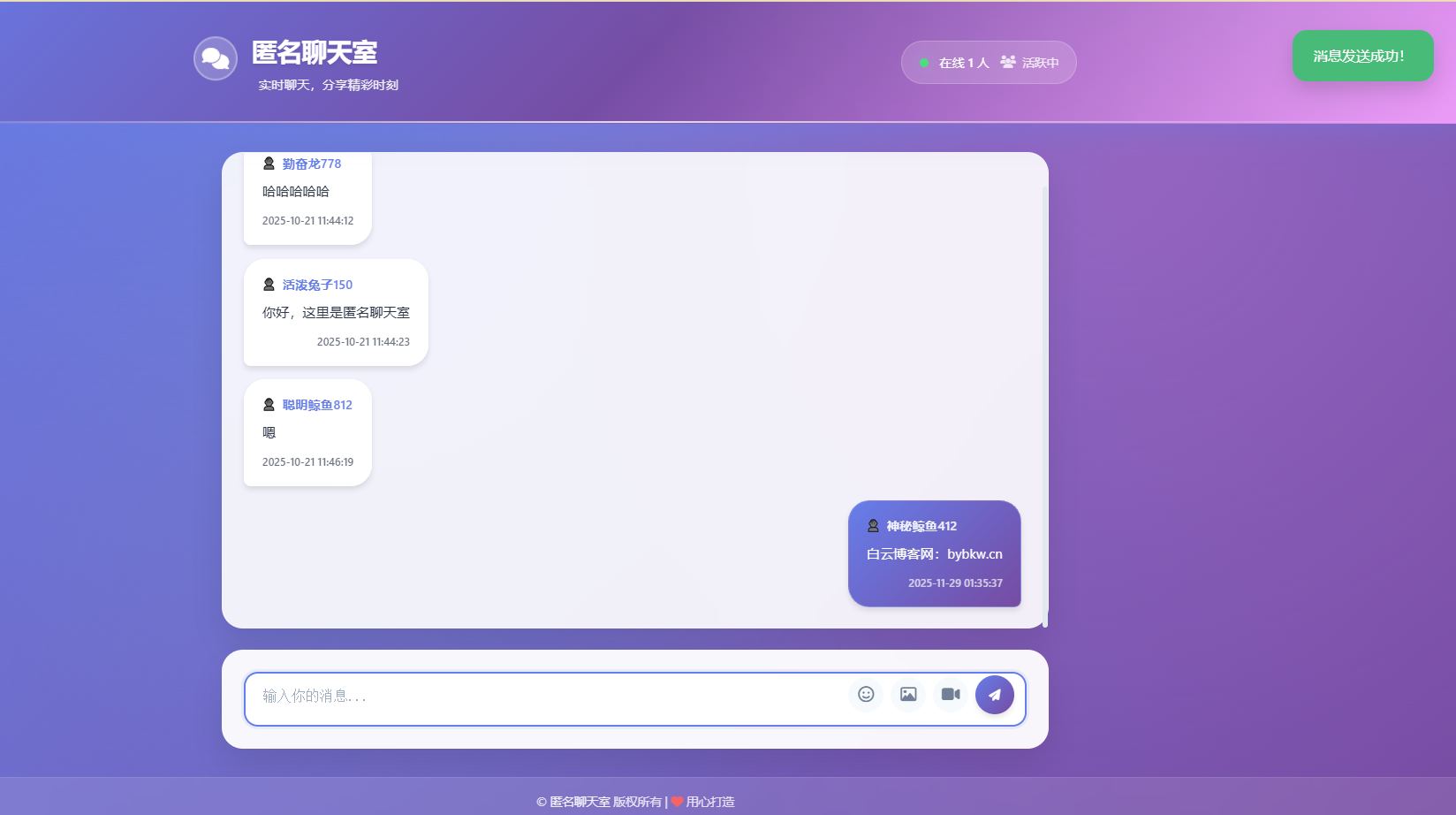 一款基于PHP开发的匿名在线聊天室源码。从截图可以看出,该聊天室采用优雅的紫色系设计,支持实时匿名聊天、在线人数显示、多媒体消息发送等功能。无论是用于网站客服、社区交流还是技术学习,这套免费源码都能满足您的需求。