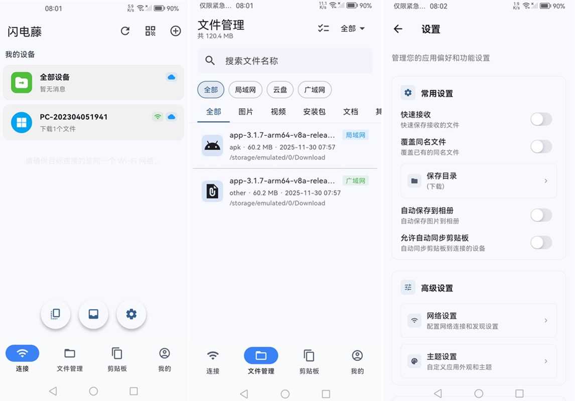 闪电藤绿色版能在不同平台的设备间高速传输各种类型的文件,无需互联网连接,不受文件大小限制。界面简洁直观,无需登录就能使用,传输方式简单,连接同一WiFi即可识别对方的设备,选择文件后一键传输,可以直接发送文本内,如网址、号码等,满足不同数据传输需求。