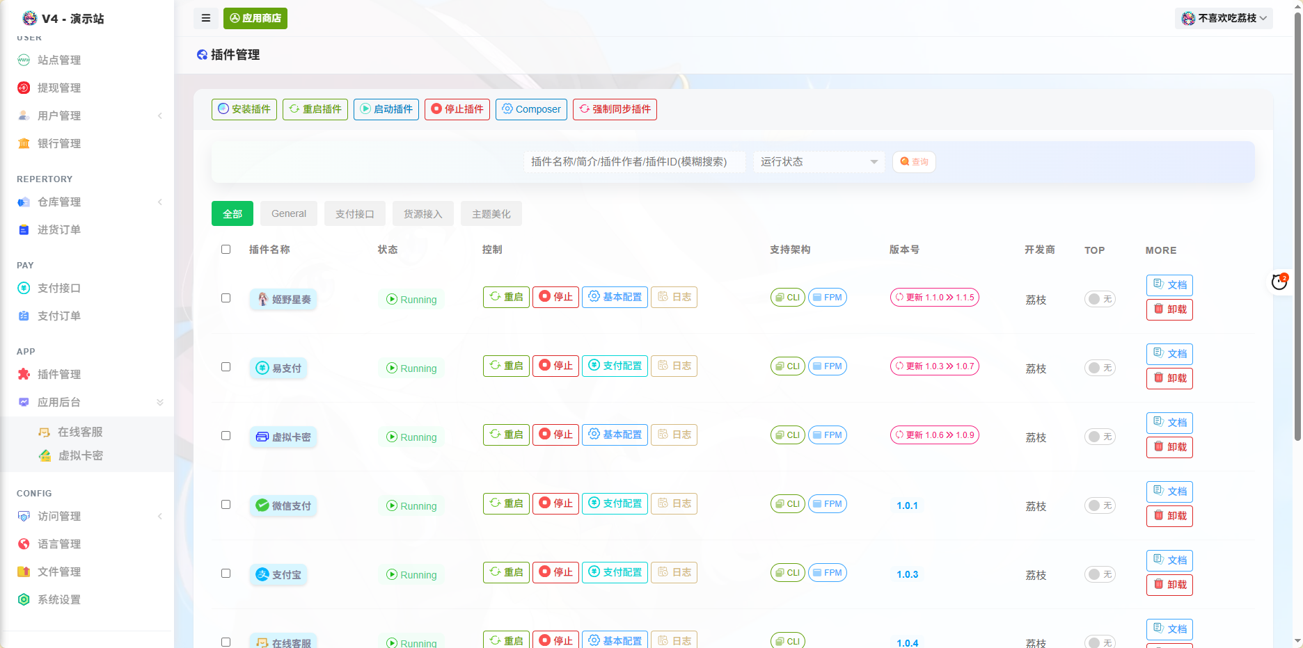 - 插件系统 :支持多种插件开发模式,包括控制器(API/VIEW)、管理菜单(后台/用户)、控制台命令(命令式插件开发)、进程(定时/后台任务等插件开发)、WebSocket(即时通讯类插件开发)、支付(支付插件开发)、货源(发货插件开发)、HOOK(页面/API钩子类插件开发)。