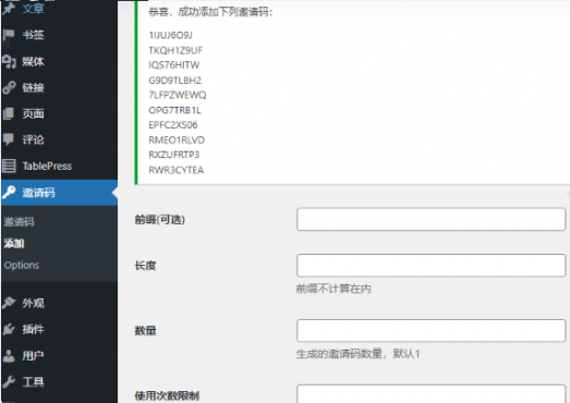 生成直接按照要求输入信息即可,生成后会在该页面直接显示邀请码。如果你需要将邀请码导入发卡站,请在此页面直接复制。否则的话只能在邀请码列表页面一个一个选择了。