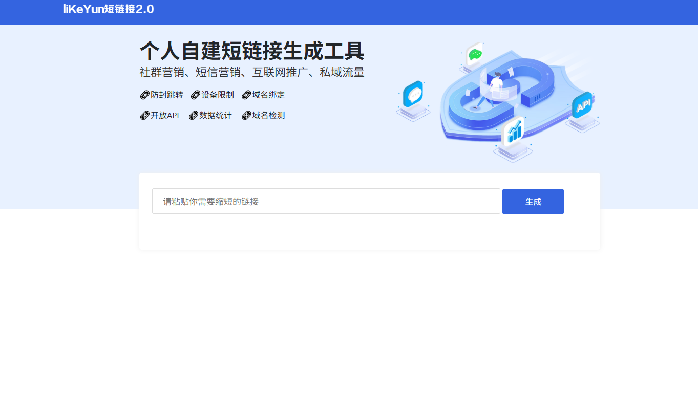 这是一套开源、免费、自建的短链接生成程序,可以通过本套程序快速自建属于自己的短链接生成平台,有丰富的功能和便捷的API,可以帮助你进行各项推广任务!功能:(1)可选直跳和防封跳转(2)设置入口域名和防封域名(3)可设置设备限制(只能微信内打...