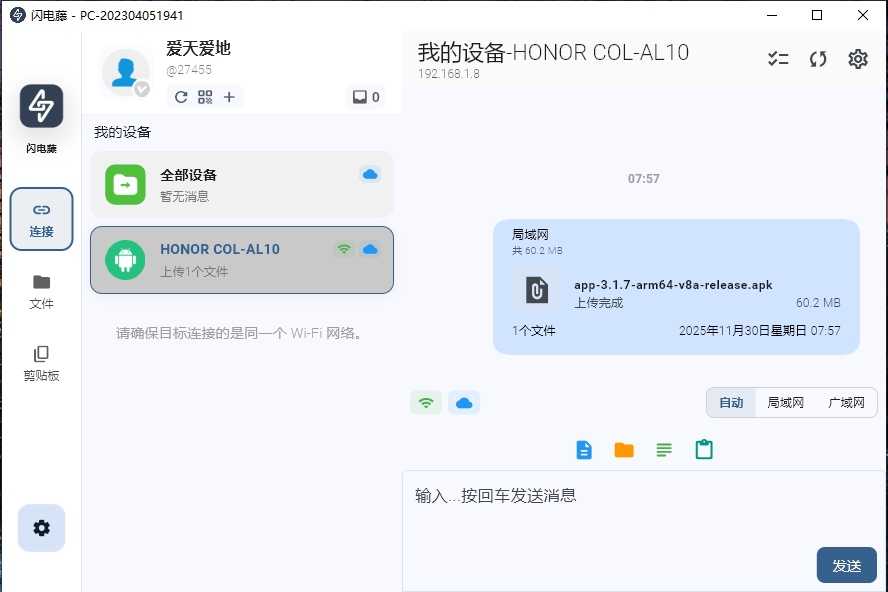 软件介绍闪电藤中文版是基于LocalSend二次开发的一款局域网文件传输工具,在它的基础上进行UI交互的重新设计,以及功能上的增强和删减,使其更加符合中国用户的使用体验。有了LocalSend,还要开发闪电藤,在于LocalSend的更新迭...